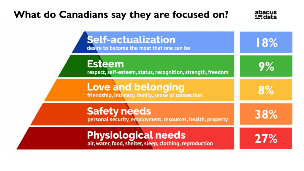 Last week, when asked where their focus is today, Canadians overwhelmingly placed themselves lower on Maslow’s hierarchy of needs. According to our findings, 38% said they are primarily focused on safety needs—things like personal security, employment stability, and access to health resources—while 27% are still focused on basic physiological needs such as food, housing, and rest.
