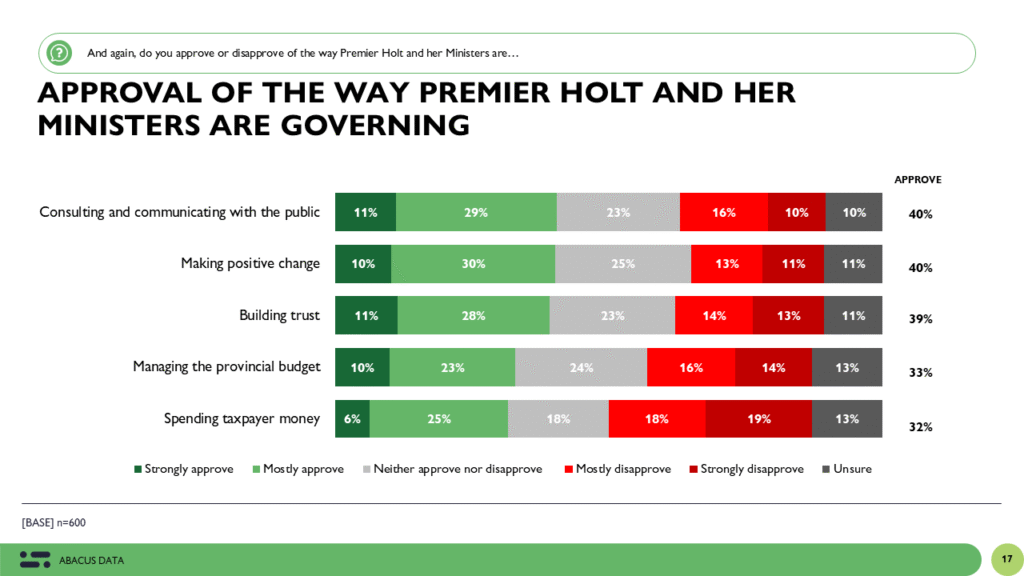 And 38% agree that the “Holt government is putting people at the centre of decision-making” and “we are starting to see positive change happening in New Brunswick.”