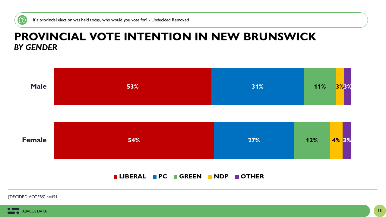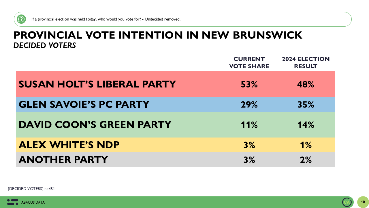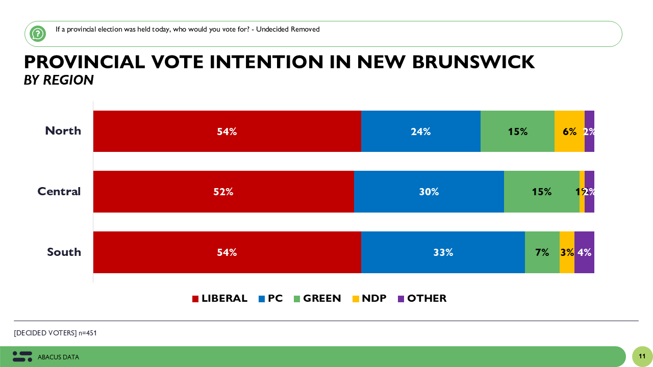 For their part, the New Brunswick Greens, led by David Coon, continue to hold steady but modest support at 11%, and the NDP, led by Alex White, remain fourth at 3%.