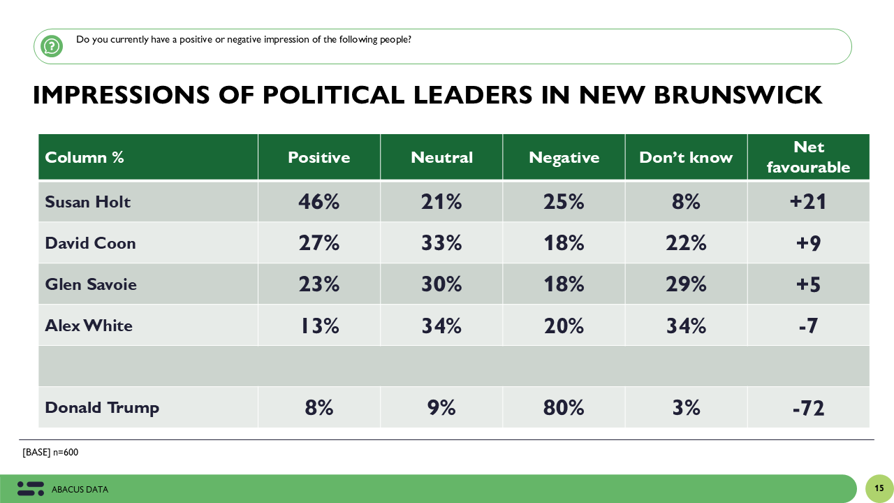 Today, we are also releasing our first New Brunswick-focused provincial politics poll. The results tell a clear story: Premier Susan Holt and the New Brunswick Liberals are more popular today than they were when they formed government, one year ago.