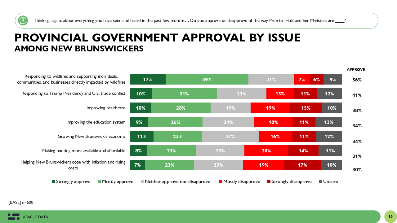 When asked to rate the recent performance of the Holt government in specific areas, 56% of New Brunswickers approve of the way Premier Holt and her Ministers responded to the wildfires that broke out last summer and caused significant damage.