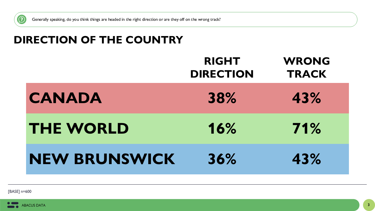 38% of New Brunswickers think things in Canada are headed in the right direction and 36% think things in their home province are on-track.