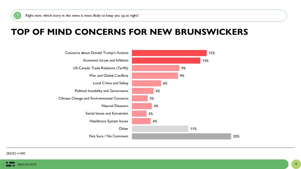 For Abacus Data, this release marks an exciting milestone: It’s our first public release from the New Brunswick Omnibus Survey, part of our ongoing investment in Atlantic Canada. With offices in Ottawa, Toronto, and Halifax, and with Kelly Bennett leading our Atlantic practice, Abacus Data continues to deliver high-quality, public opinion and marketing research that helps clients and the public understand the attitudes shaping this region’s future.