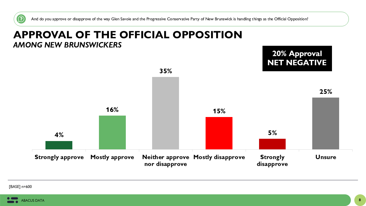 Public familiarity with the interim leader remains limited, and only 20% of New Brunswickers express approval of the Official Opposition’s recent performance, with slightly more disapproving (21%), although only by a difference of one-point.
