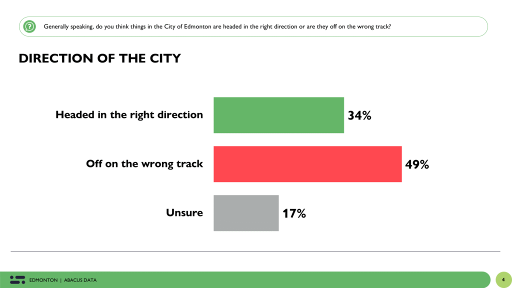 Edmontonians remain more negative than positive about the direction of their city. Only 34% believe the city is headed in the right direction, while 49% think it’s off on the wrong track. Another 17% aren’t sure.