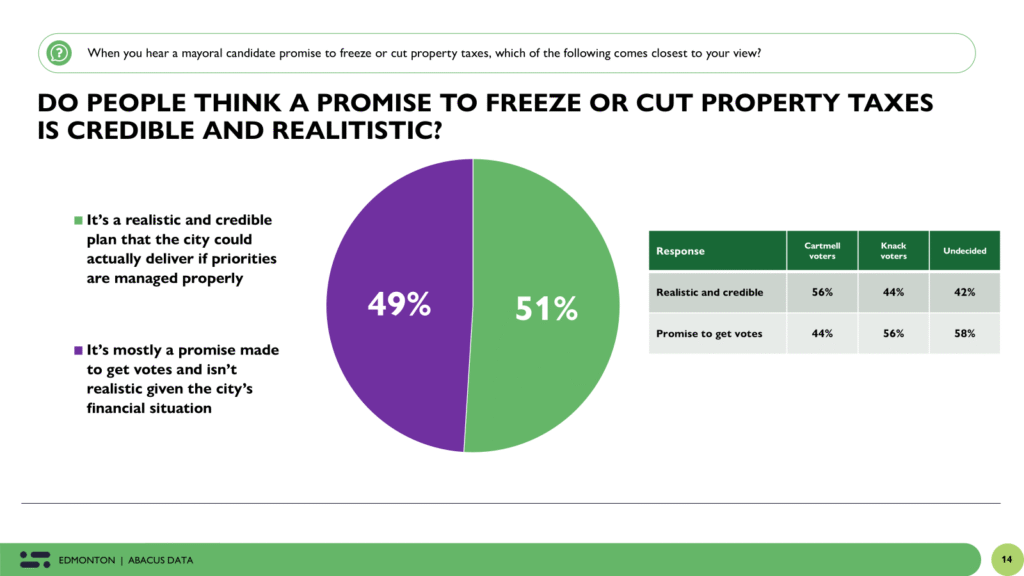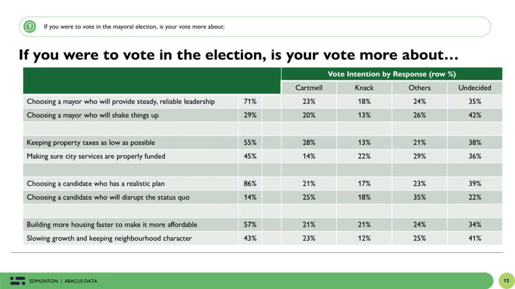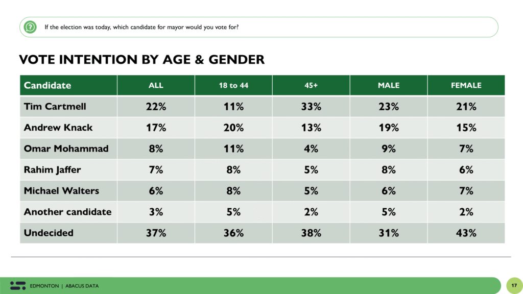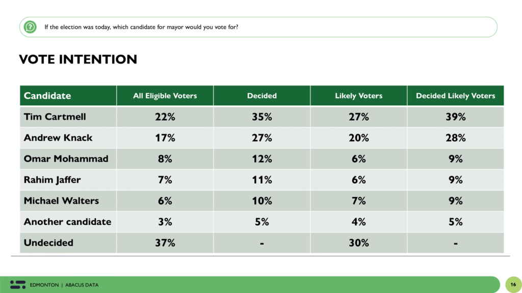 “This election for Edmonton mayor remains wide open. Tim Cartmell has a lead — especially among older voters and those craving stability — but a large number of Edmontonians are undecided. The public is focused on serious concerns like housing, homelessness, and public safety, and they’re looking for realistic, credible leadership to get things under control.