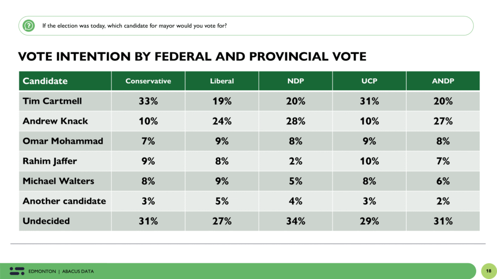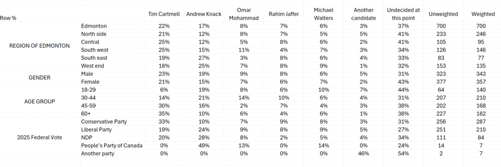 Vote intentions also reflect partisan leanings: Cartmell leads among UCP and Conservative voters (31–33%). Knack is strongest among NDP and Liberal supporters (28% and 24%).