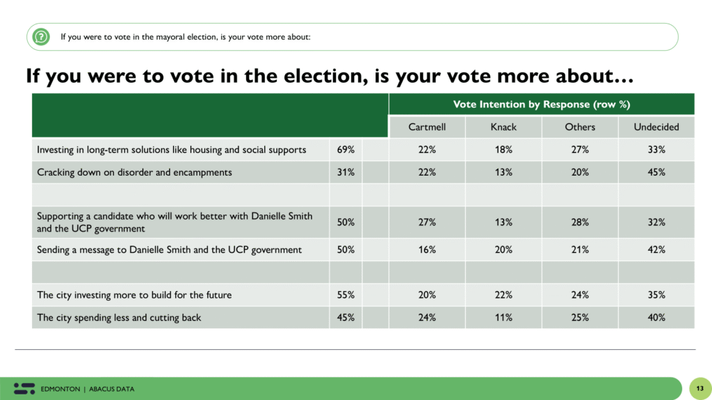 Half of Edmonton voters (50%) say their vote is more about sending a message to Danielle Smith and the UCP than finding someone who can work with her. The other half say they want a mayor who will work better with the provincial government.