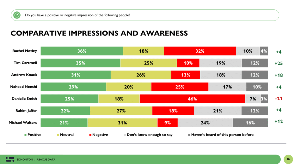 In contrast, Premier Danielle Smith stands out as the most polarizing figure tested, with a -21 net score (25% positive vs. 46% negative). While she’s not a candidate in the race, her presence looms large reinforcing her potential as a motivator for voters who want to send a message to the provincial government, and a reminder that provincial politics are very much in the background of this municipal campaign.