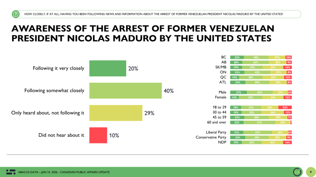 While the survey finds Canadians divided overall, the differences by federal party support are pronounced. Conservative voters are far more likely to interpret Maduro’s removal as a good thing, while Liberal and NDP voters are much more likely to view it negatively. The event is being processed less as a question about Venezuela and more as a question about who is doing it, and what it signals about power, legitimacy, and precedent.
