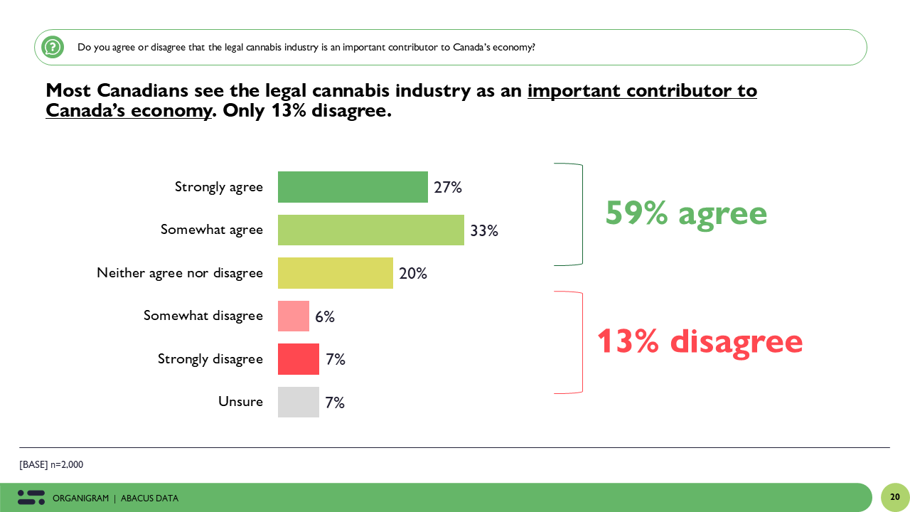 There is also little political difference. 69% of recent Liberal voters and 58% of recent Conservative voters agree that legal cannabis industry is an important contributor to Canada’s economy.