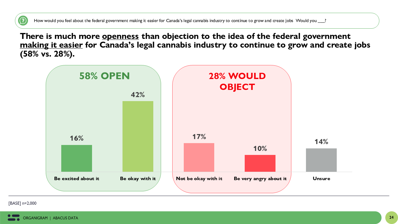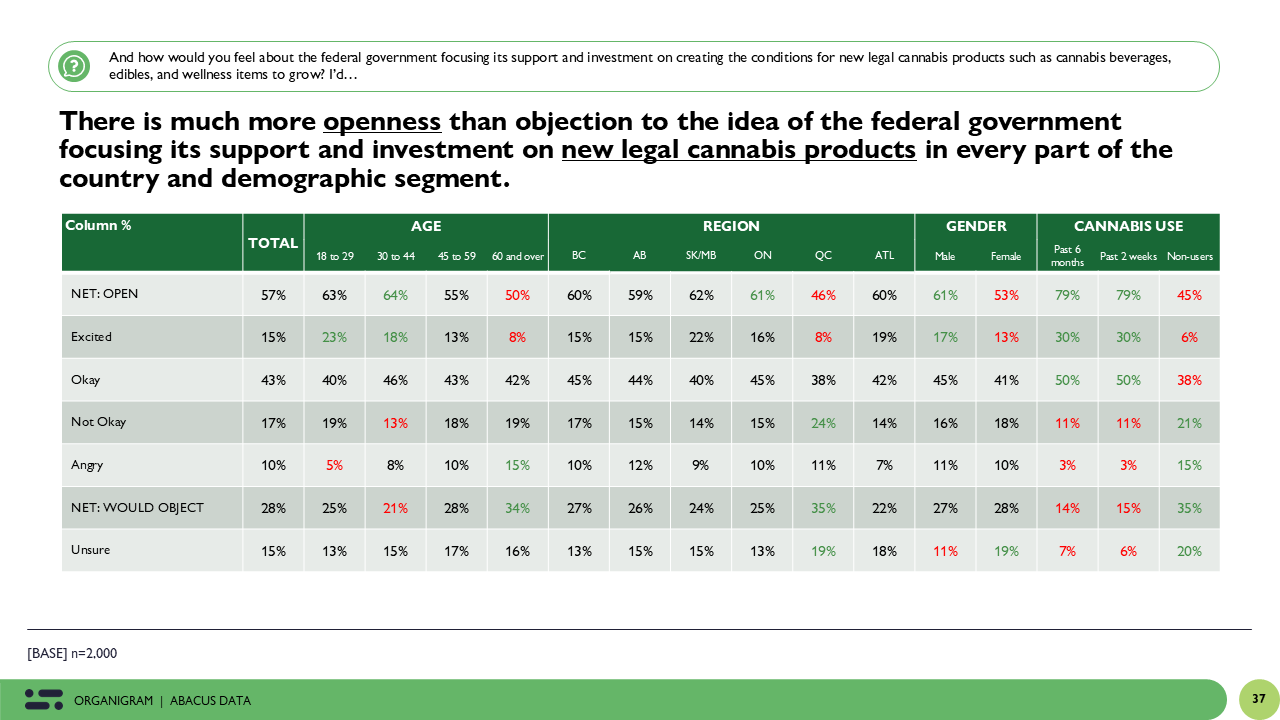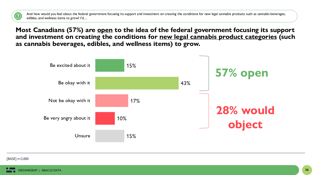 One of the clearest takeaways from this study is the untapped potential in emerging cannabis categories. A majority (57%) of Canadians say they’re open to the federal government investing in the growth of cannabis beverages, edibles, and wellness products. Only 28% would object.