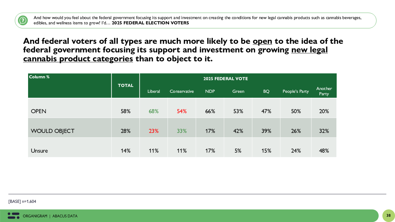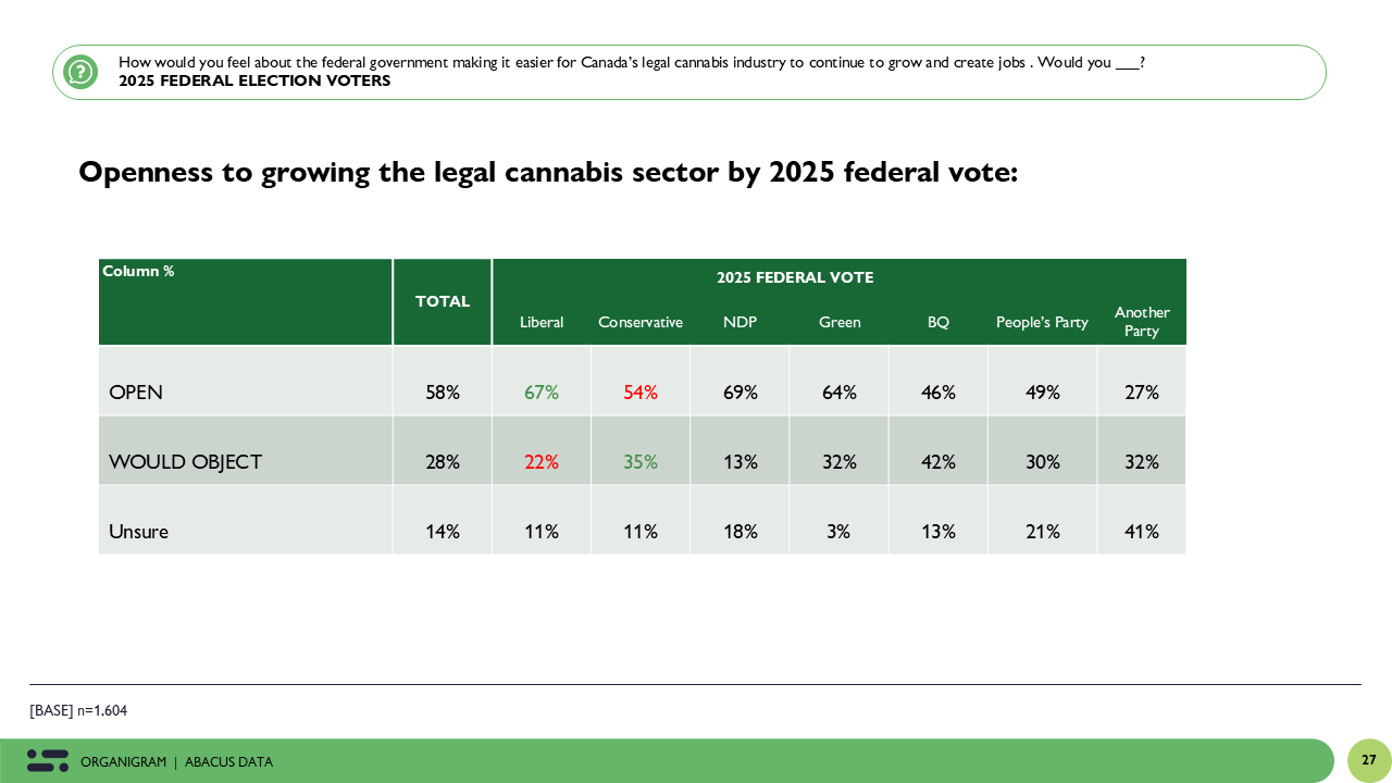 At a time when economic headwinds are blowing north from Washington—driven by U.S. protectionism and a trade war sparked by the Trump administration—many Canadians appear ready to double down on homegrown economic sectors that can offer stable jobs and export potential. Legal cannabis is increasingly viewed not only as a normalized consumer product but as a sector worth investing in, supporting, and growing. The data reveals a clear political opening for federal leaders: cannabis is not a liability; it’s an opportunity.