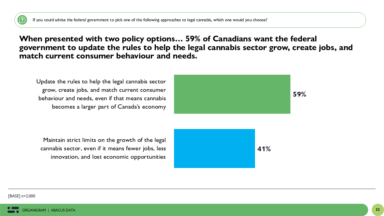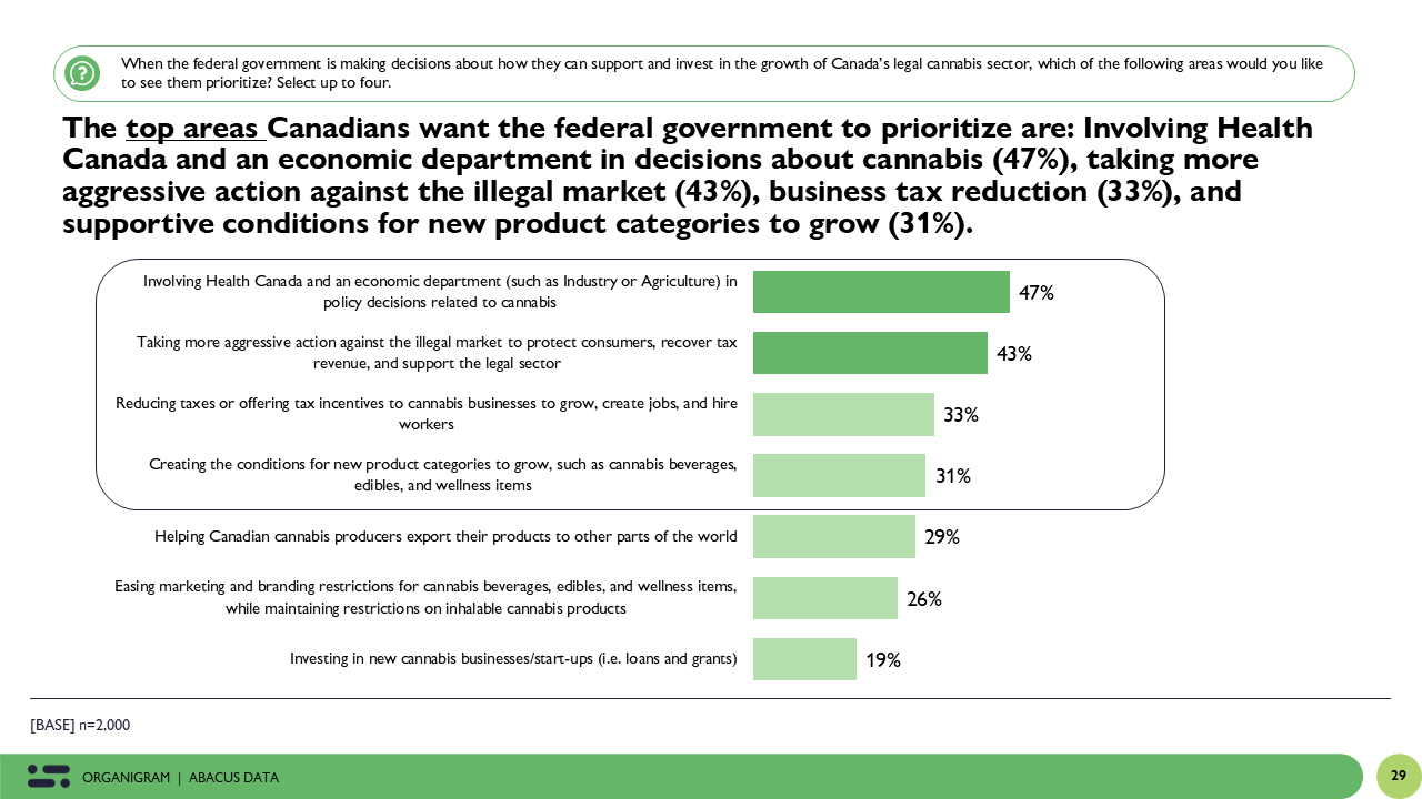 - 47% want economic departments like Industry or Agriculture involved in cannabis policy decisions alongside Health Canada.