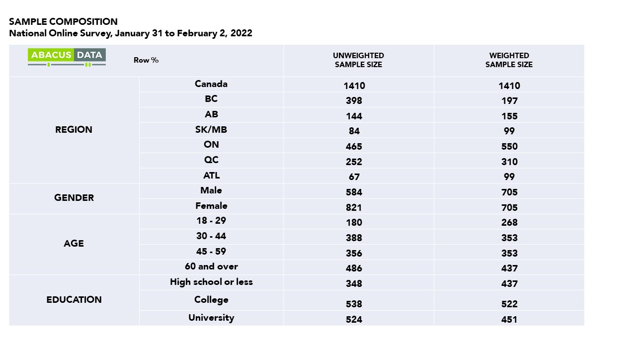 The survey was conducted with 1,410 Canadian adults from January 31 to February 2, 2022. A random sample of panelists were invited to complete the survey from a set of partner panels based on the Lucid exchange platform. These partners are typically double opt-in survey panels, blended to manage out potential skews in the data from a single source.