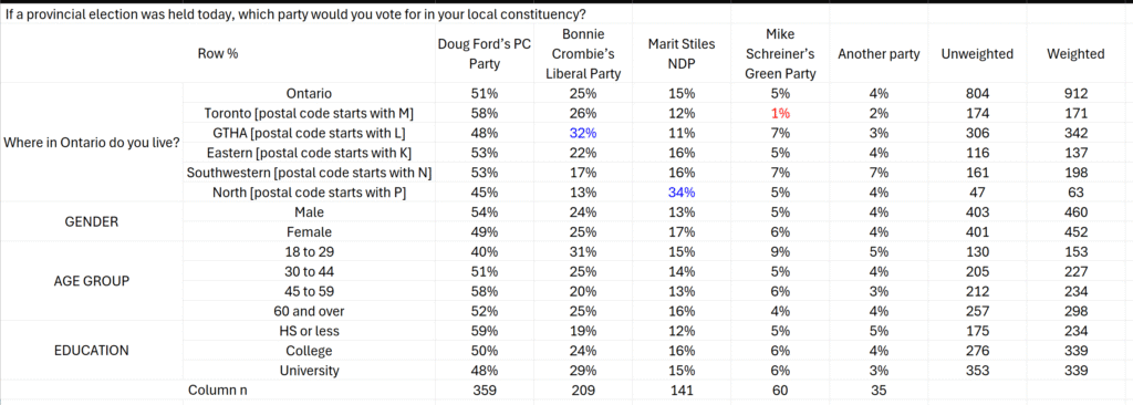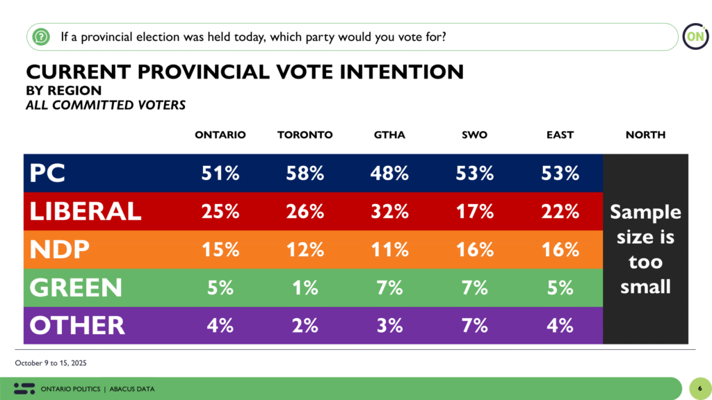 Regionally, the PCs lead in every part of the province. In Toronto, they command 58%—a figure once unthinkable for a centre-right party in the city—compared to 26% for the Liberals and just 12% for the NDP. In the Greater Toronto and Hamilton Area (GTHA), the PCs lead 48% to the Liberals’ 32%, and they hold double-digit advantages in Southwestern and Eastern Ontario.