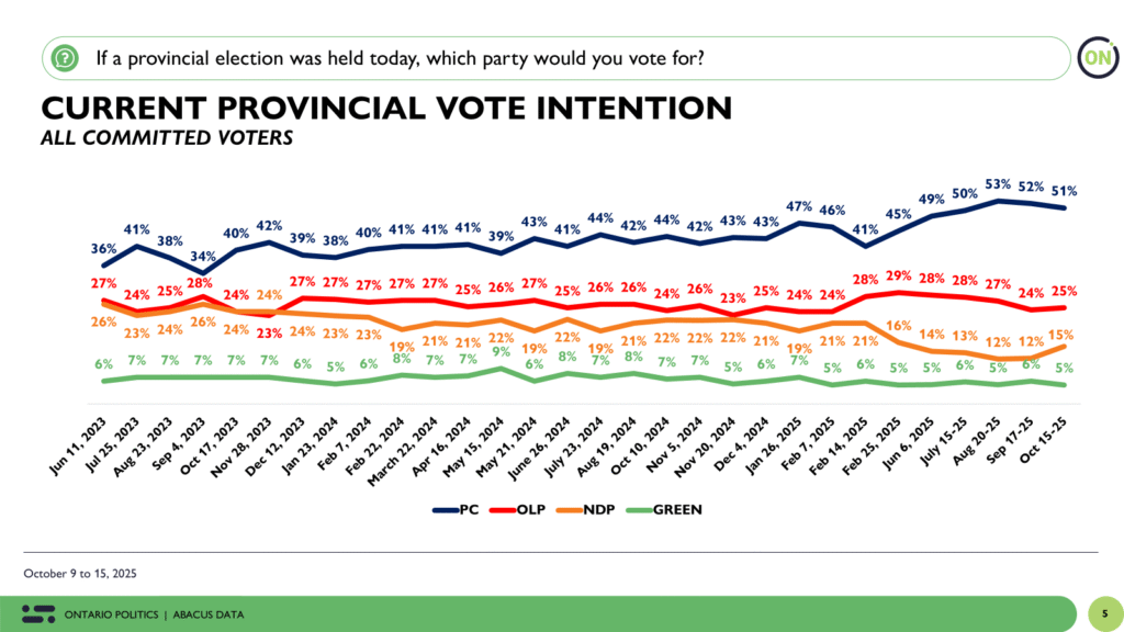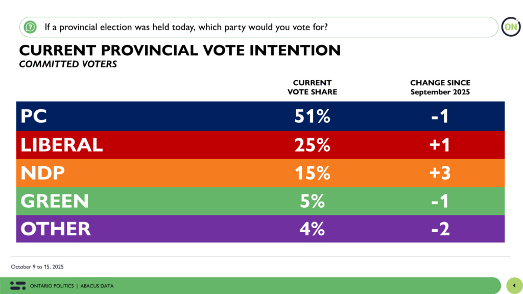 Our latest survey of 1,000 eligible voters, conducted during a relatively quiet week in Ontario politics, finds the PCs holding at 51%, the Liberals ticking up slightly to 25%, and the NDP climbing to 15%, their highest share in months.