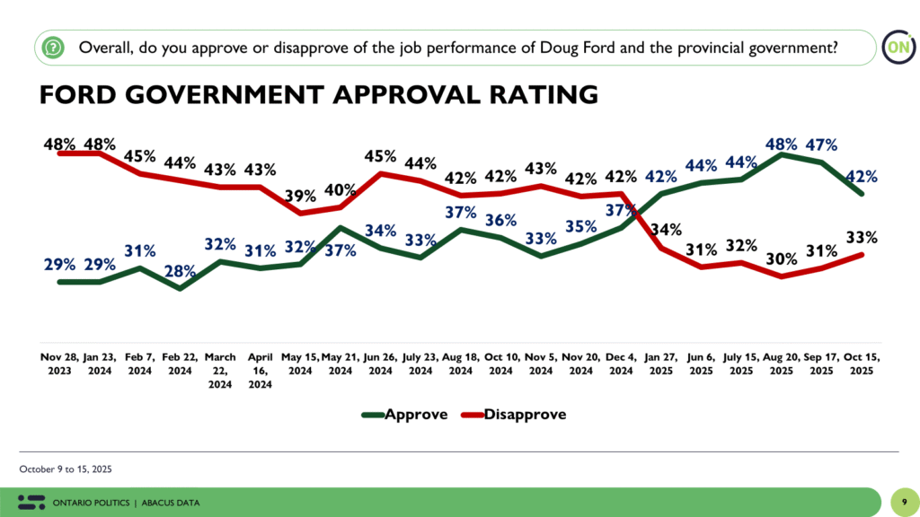 Approval of the Ford government stands at 42%, a five-point drop from September, while disapproval has climbed to 33%, up two points. Although still in net positive territory (+9), this is the lowest approval Ford has seen since the beginning of the year.