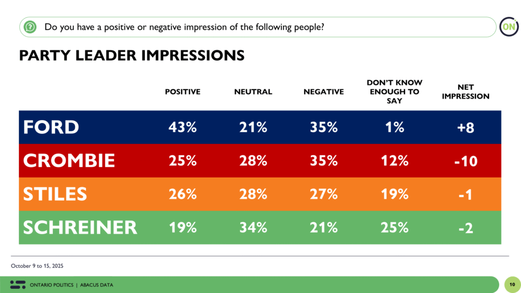 Bonnie Crombie, now in a caretaker role, continues to slide: only 25% of voters view her positively, while 35% view her negatively—a net -10. Marit Stiles and Mike Schreiner remain less defined to most voters, with net scores of -1 and -2, respectively.