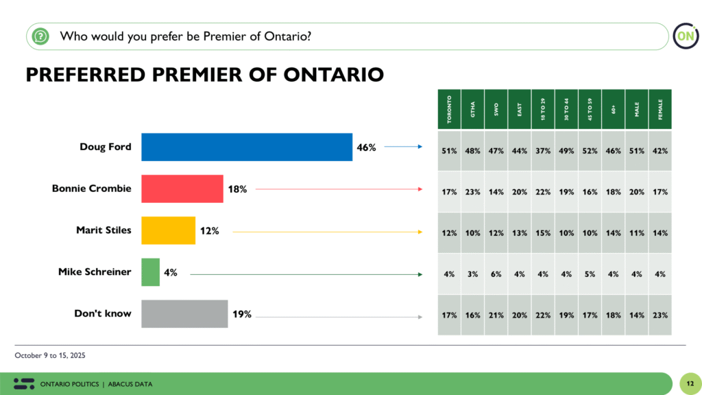 Doug Ford remains the preferred choice for Premier for 46% of Ontarians. Crombie trails at 18%, Stiles at 12%, and Schreiner at 4%.