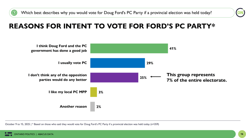 Ford’s 26-point lead over the Liberals mirrors last month’s results and signals the enduring stability of his coalition. But while top-line numbers appear rock-solid, the motivations behind that support merit closer examination.