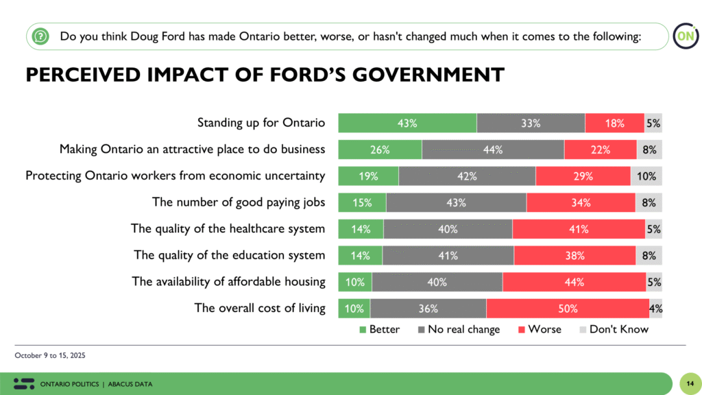 New questions added to this wave also offer deeper insights into how Ontarians view the Ford government’s impact. While 43% believe the Premier has made Ontario “better” at standing up for the province, and 26% credit him with making the province more attractive for business, most issues show tepid or negative evaluations.