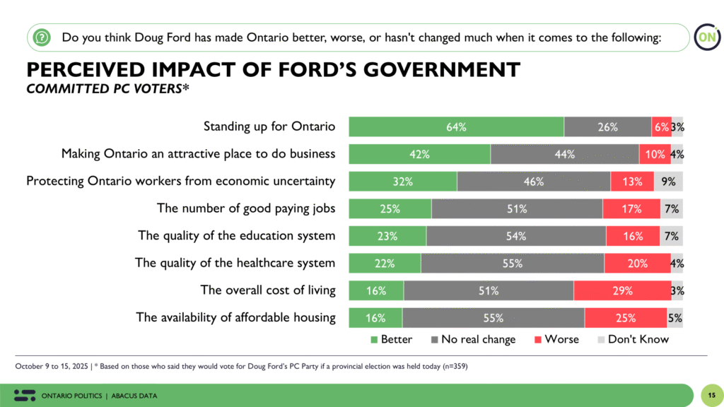 Beneath those steady toplines, however, the poll reveals important undercurrents about voter attitudes, particularly among Ford’s own base. One in four PC voters say they are supporting the PC Party not because of its record, but because they don’t see a better option. This quiet vulnerability comes as the Ontario Liberals search for a new leader and the NDP continues to struggle with visibility and relevance.