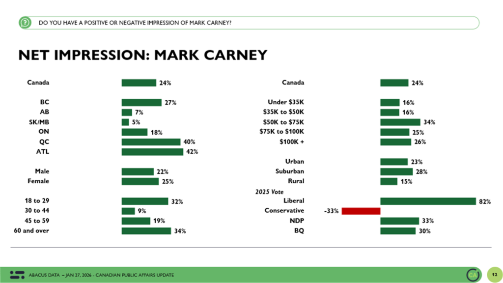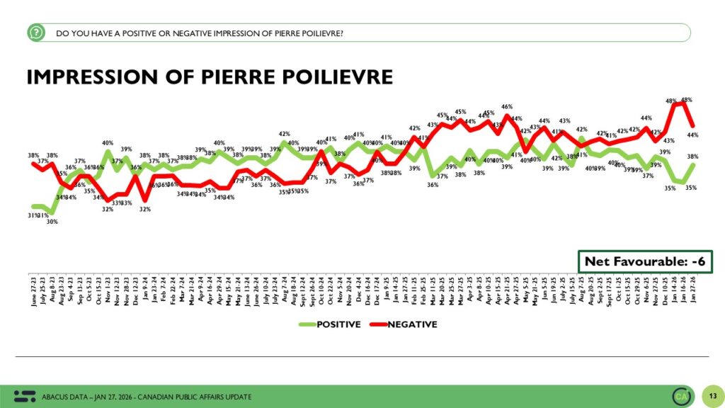 Pierre Poilievre’s numbers tell a different but important story. After two consecutive surveys that showed elevated negative impressions, his image has rebounded modestly. He now sits at a net impression of -6, close to where his numbers have been for much of the past year.