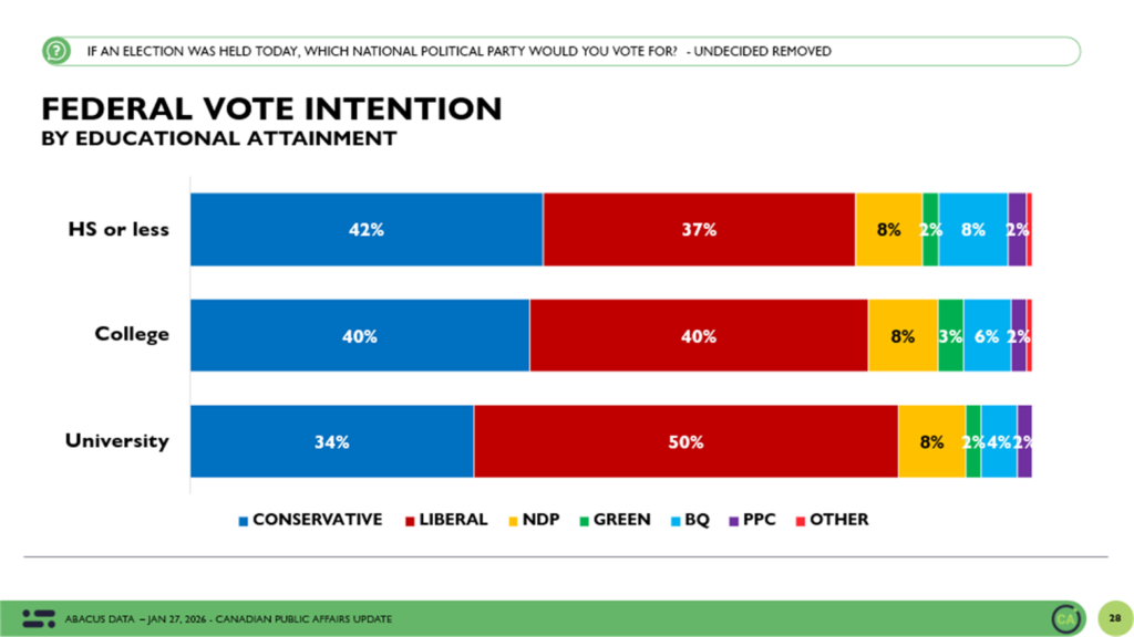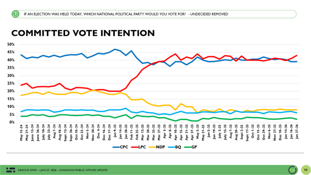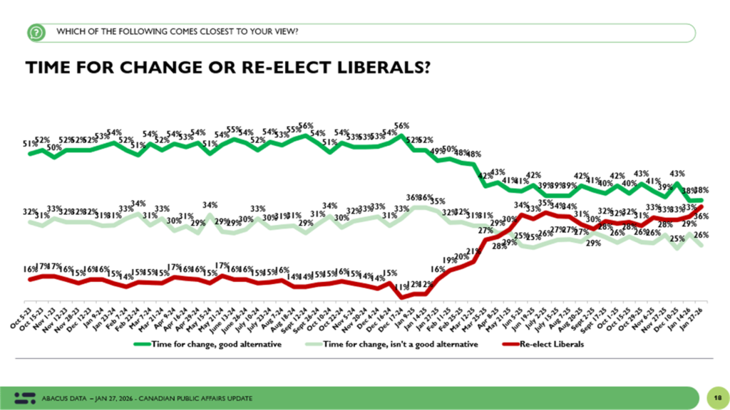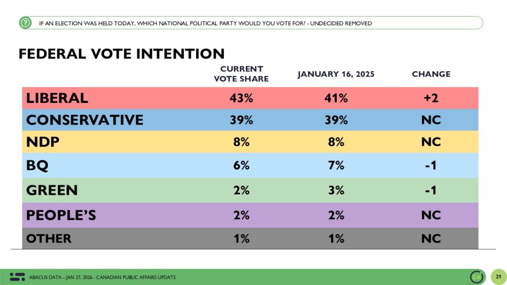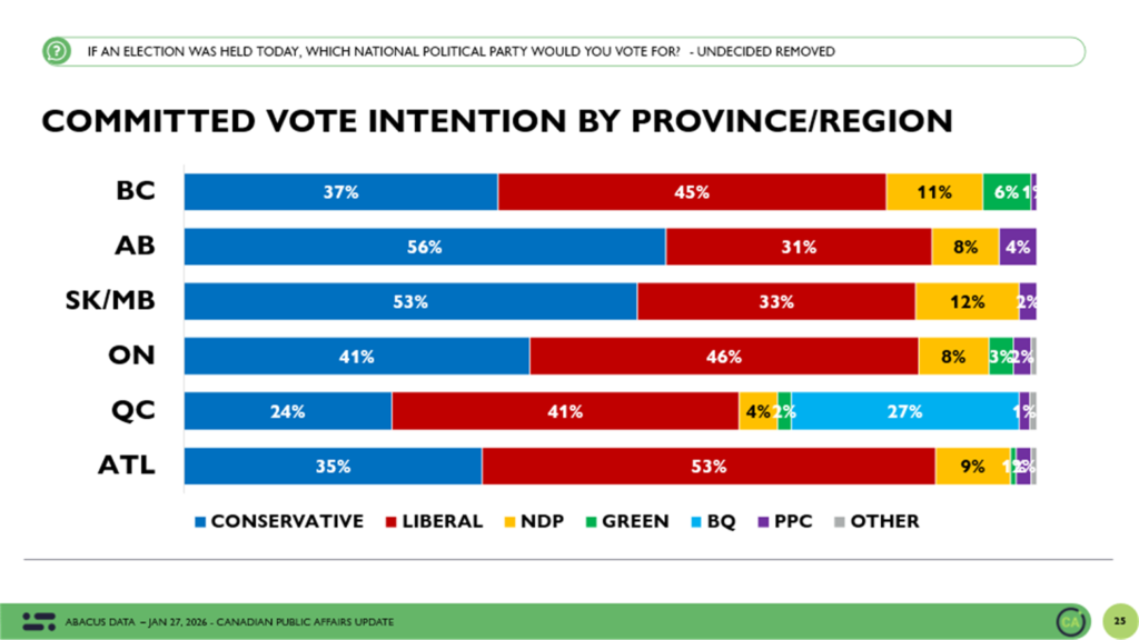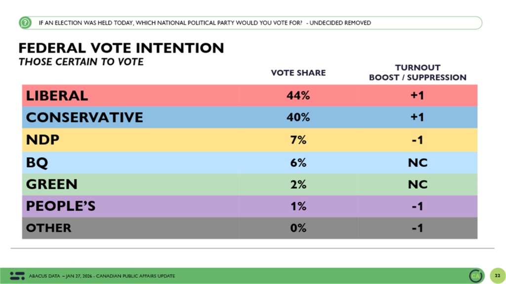 Between January 22 and 27, 2026, Abacus Data surveyed 2,498 Canadian adults as part of our ongoing federal political tracking.