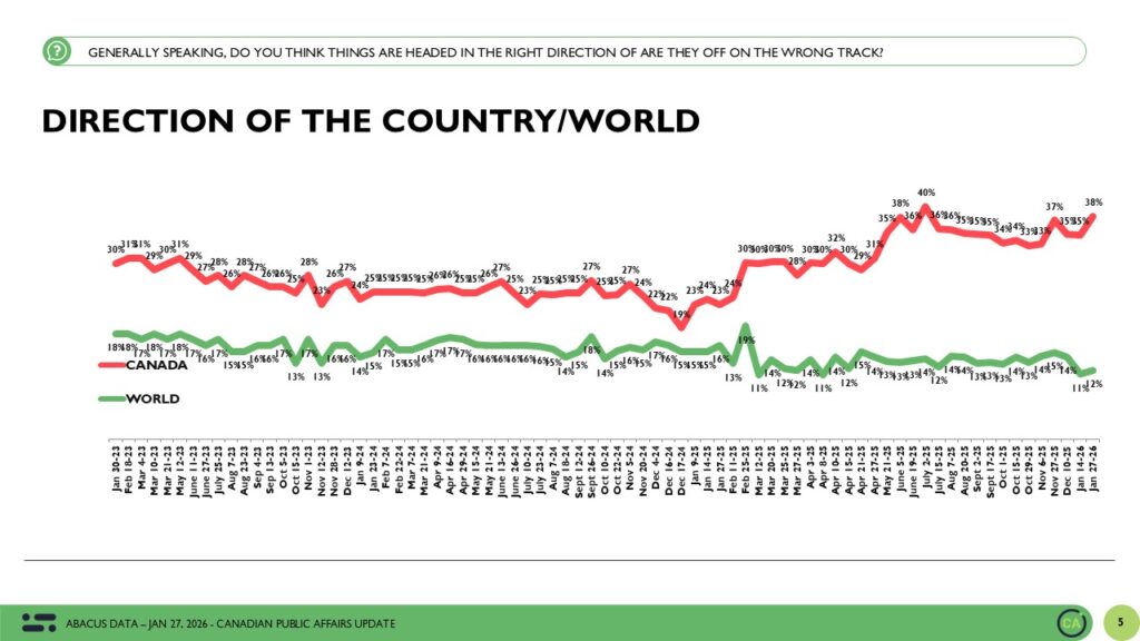 Thirty-eight percent of Canadians now say the country is headed in the right direction, while 45 percent say it is on the wrong track. This represents a slight improvement from earlier in January and continues a gradual upward drift in optimism that began late last year.