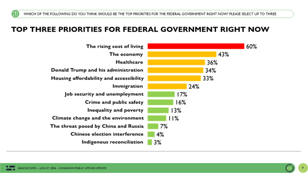 The rising cost of living remains the top federal priority, selected by 60 percent of Canadians. The economy follows at 43 percent, with healthcare close behind at 36 percent.