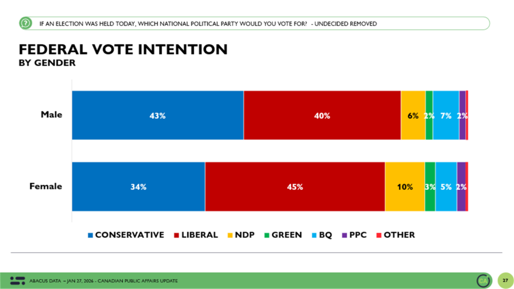 Conservatives have a three point lead among men while the Liberals now lead by 12 among women.