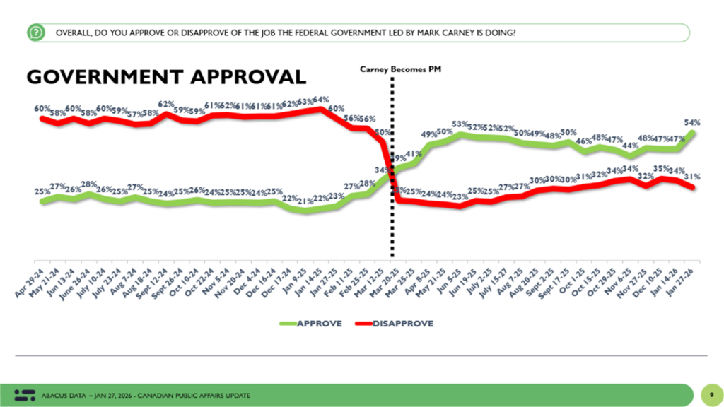 Approval of the federal government led by Mark Carney now stands at 54 percent, while 31 percent disapprove. This marks a clear improvement compared with earlier this month and places government approval at one of its strongest levels since Carney became Prime Minister. The last time the federal government had this level of approval was in May 2020 near the start of the COVID-19 pandemic.