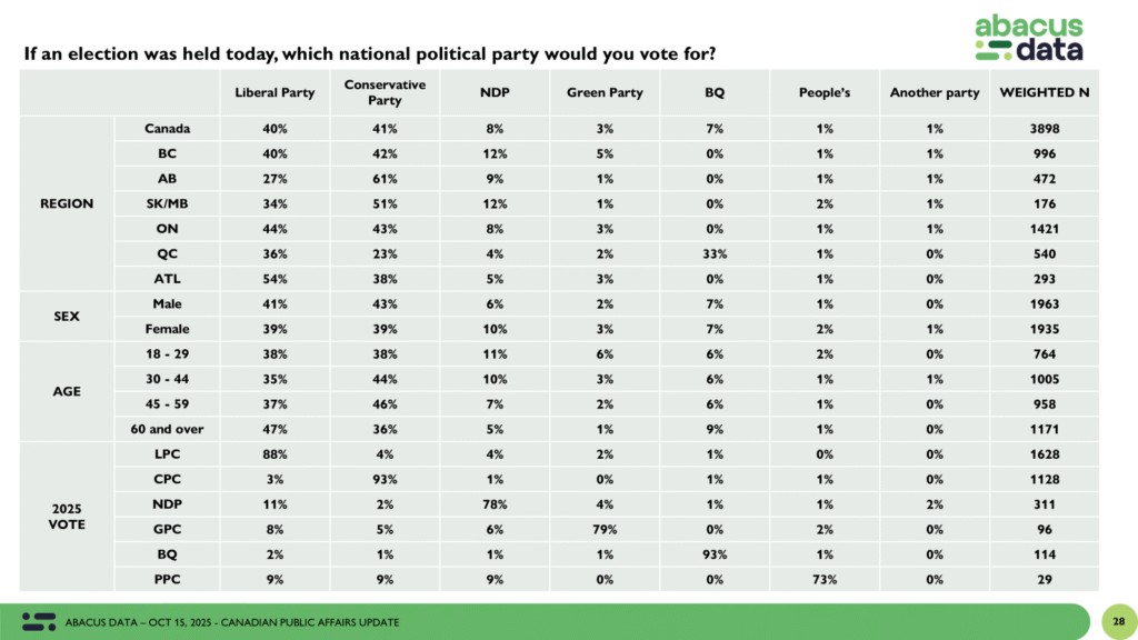 Between October 9 and 15, 2025, Abacus Data surveyed 4,501 Canadian adults on the current state of federal politics. The findings show a landscape largely unchanged at the topline — a deadlocked race between the Liberals and Conservatives, steady impressions of Prime Minister Mark Carney, and consistent anxieties about cost of living and economic stability.